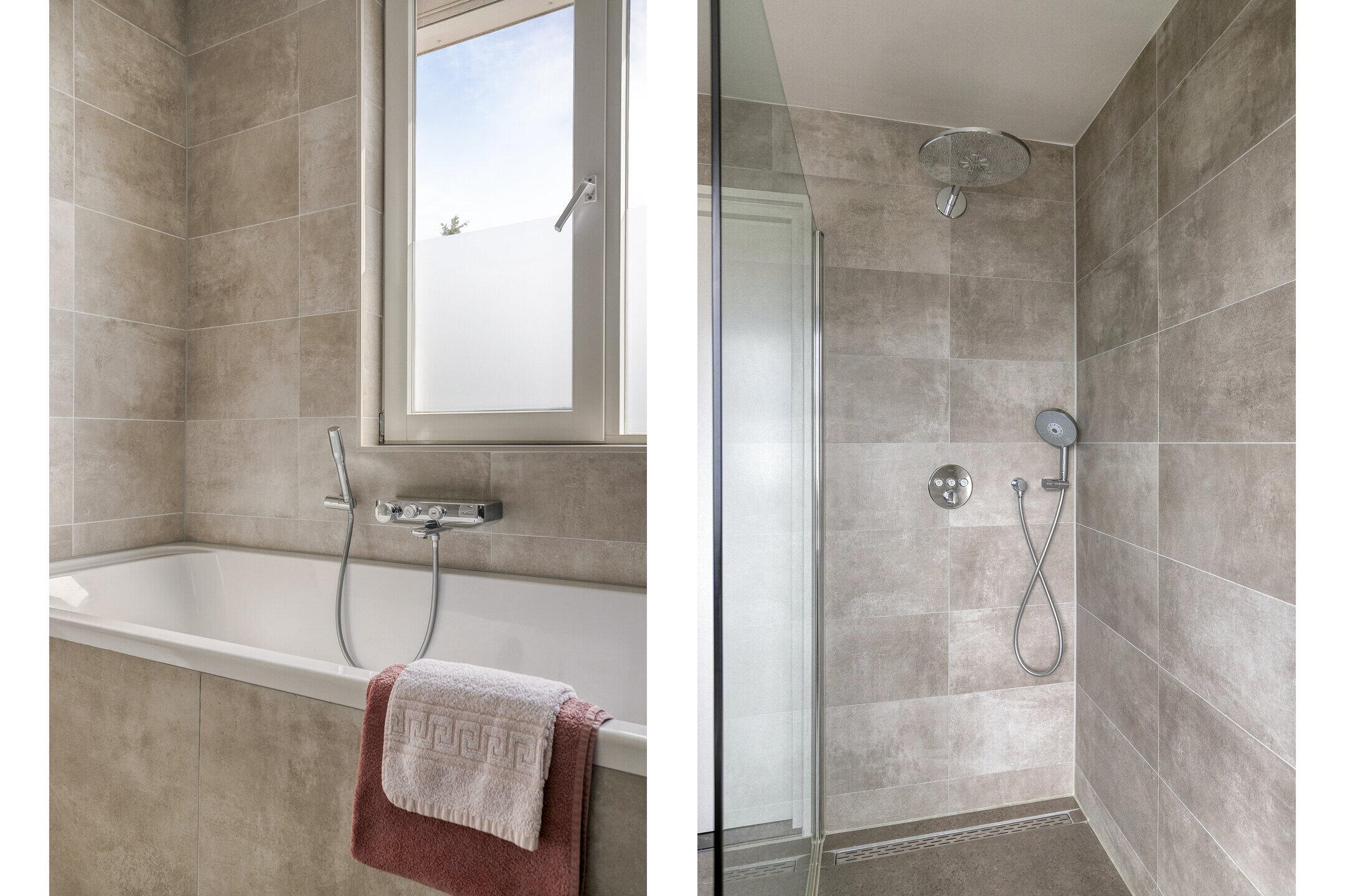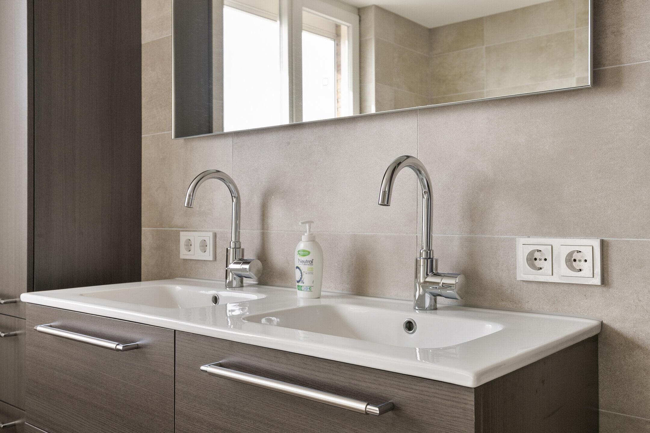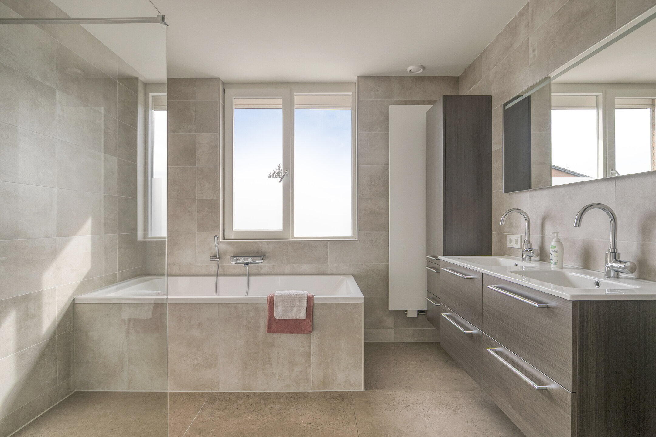 De moderne badkamer is een echte wellness-ervaring: uitgerust met een dubbele wastafel, een ruime inloopdouche én een comfortabel ligbad. Hier start en eindig je de dag in alle rust.